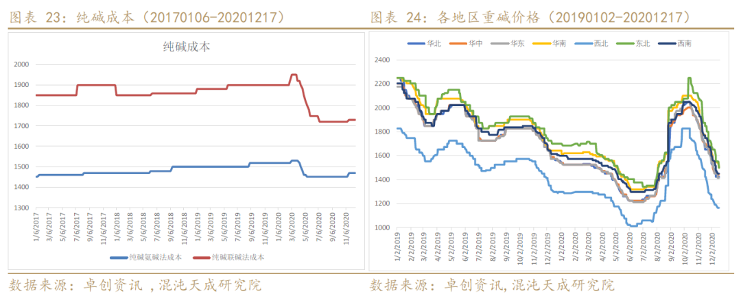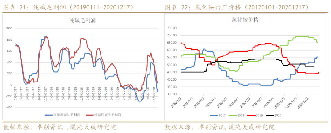 本周纯碱价格基本持平,纯碱厂家毛利润继续回落,联碱和氨碱厂家利润都较前期下降较多,部分厂家处于亏损状态,近期由于氯化铵价格没有大幅下滑,联碱厂家毛利润稍好于氨碱厂家。