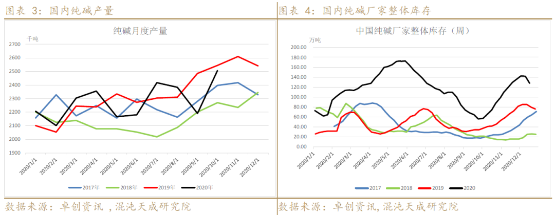 本周中国纯碱厂家整体库存128万吨左右(含部分厂家外库及港口库存),环比减少9.7%,同比增加52.6%。