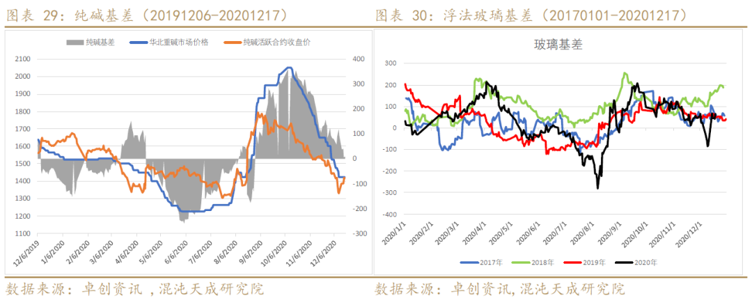 本周纯碱厂家继续限产检修,开工负荷开始下调,价格跌之低位后下游需求开始明显好转,厂家库存大幅下降,纯碱价格待涨,预期行情震荡偏强。浮法玻璃现货市场各地产销情况较好,北部地区受天气影响较大,需求走弱,南方地区处于赶工状态需求转好,玻璃整体库存继续大降,部分厂家价格继续小涨,短期内对行情有支撑,12月份赶工之后需求可能回落,建议05合约逢高卖出。