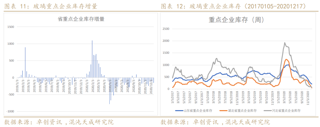 本周浮法玻璃各省重点企业库存1347万重量箱,较上周下降16%,从4月中旬开始,浮法玻璃库存开始降库,经过八个多月的大幅去库,当前库存同比减少51%,近期市场成交较好,厂家库存处于历史低位,部分厂家价格继续小涨。