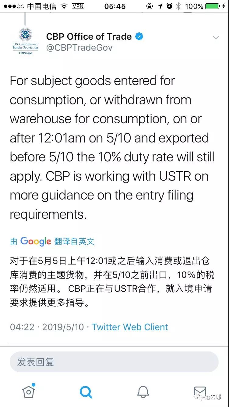 根据cbp的说法,只要在5月10日前从中国出口了,即使货物还未抵港,仍可按照10%税率征收!