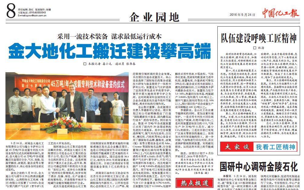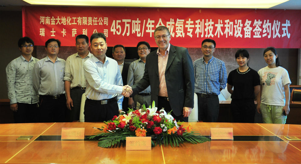 5月18日,河南金大地化工有限责任公司与瑞士卡萨利公司就45万吨/年合成氨专利技术和设备签约仪式在河南郑州举行。至此,金大地公司45万吨/年合成氨搬迁改造项目空分、气化、变换、低温甲醇洗、液氮洗、氨合成等主要装置的技术、核心设备合同全部完成签约。