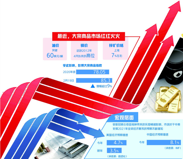 最近,大宗商品市场红红火火:油价突破60美元/桶,铜价达到2012年4月以来的高位,锌矿价格也上涨了7%左右。受此影响,彭博大宗商品指数从2020年底的78.05上升至2月19日的85.3,增幅超过9%,不仅从去年4月份58.87的谷底强势反弹,而且超出了2019年底的水平。