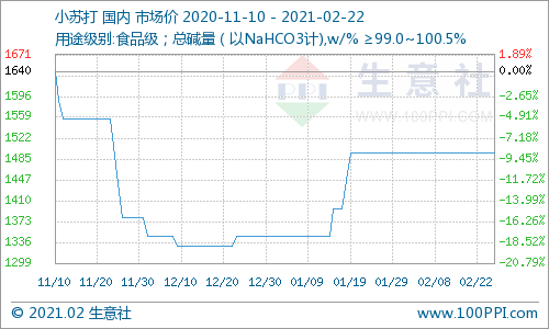 据生意社监测数据显示,小苏打价格暂稳运行。2月22日国内市场均价为1496.67元/吨。2月21日小苏打商品指数为99.34,与昨日持平,较周期内最高点121.68点(2020-10-21)下降了18.36%,较2020年12月22日最低点88.27点上涨了12.54%。(注:周期指2020-09-01至今)