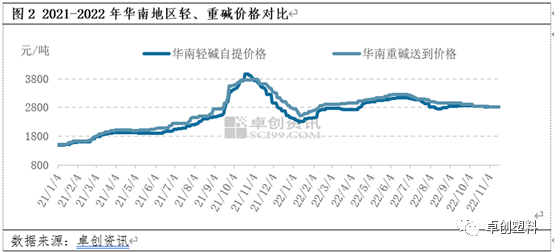华南地区纯碱供应远远不能满足当地需求,主要靠华中、华北地区货源补充,受外部区域价格影响较为明显。2021-2022年华南地区轻、重碱价差多数时间维持在50-200元/吨,经测算,华中地轻碱、重碱价格的相关系数在0.96。9-11月份华南地区浮法玻璃冷修产线有6条左右,对于重碱用量明显减少,对重碱价格支撑减弱,市场价格整体趋弱,阶段内重碱主流终端价格下滑140元/吨左右。轻碱价格虽然也有所下滑,但由于华中地区轻碱货源偏紧,运往华南地区货源量有所收紧,导致华南地区轻碱价格跌幅相对有限,9-11月份轻碱价格累计下滑60元/吨左右。当前华南地区轻、重碱终端价格仍维持倒挂,终端价差评估在50-80元/吨。
