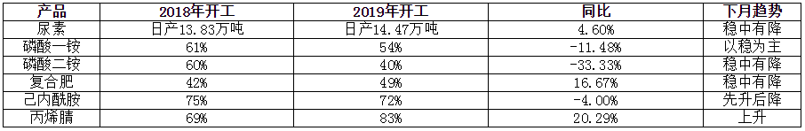 需求方面的偏弱,也是比较明显。由下游开工图可以看出,化肥市场今年开工尤其低,磷肥行业最为明显,虽然复合肥市场开工有所提升,主因备肥季的不明显,发运期后延,下游观市氛围浓厚,出现集中生产。不过丙烯腈行业开工大幅提升,主因2018年国内大部分丙烯腈工厂集中例行大检修,因此开工显的较低。