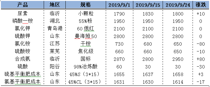 进入9月份以来,原料面整体延续弱势,中上旬尿素受印标以及环保限产等的影响,市场出现一波反弹,但是随着印标的公布,标价低于国内价格,加之国内需求无利好的情况下,价格回落;合成氨本月价格呈先落后涨的趋势,下旬开始随着国庆道路运输受阻,氨量有所收紧的情况下,市场价格有所抬涨;其他原料方面氯化铵以及硫酸本月降幅明显,核算氨化工艺硫基平衡肥成本较月初整体变动不大,生产企业毛利率维持在27%左右。