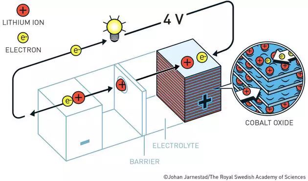 以Goodenough的阴极为基础,吉野彰在1985年发明了第一个商业上可行的锂离子电池。他没有在阳极使用活性锂,而是使用石油焦,这是一种碳材料,像阴极的钴氧化物一样,可以插入锂离子。 于是,研究者获得了一种重量轻且耐用的电池,在性能衰竭之前可以充电数百次。