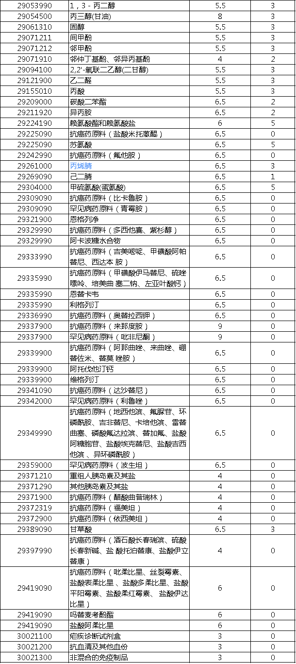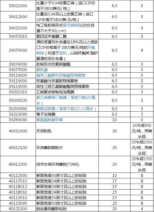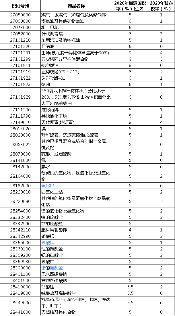 进口最惠国税率:自2020年1月1日起对859项商品(不含关税配额商品)实施进口暂定税率,其中包含200多项化工相关产品:
