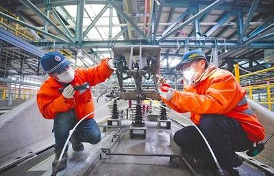 随着复工复产来临,铁路运输迎来春运返程客流,铁路部门严格落实各项防控措施,全力保障出行旅客和铁路职工健康安全。图为南昌车辆段机械师正在对动车组受电弓进行巡检作业。图片来源:人民日报