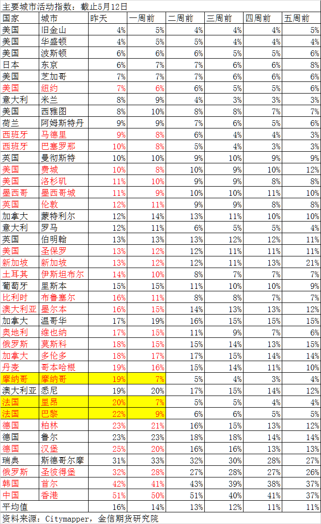 全球复工复产速度加快,尤其是欧洲主要城市活动指数快速攀升,为全球经济复苏注入活力。截止5月11日,相对于上周,欧洲复工复产回升最快,法国里昂和巴黎城市活动指数分别较上周提升13个百分点,德国柏林、鲁尔和汉堡城市活动指数均高于23%,处于主要经济体大城市的较高水平。美国复工复产喜忧参半,美国9个主要城市中只有4个城市城市活动指数回升,根据疫情最新数据,美国复工复产一大半州的疫情出现反弹,一定程度延缓了美国复工复产的进程。全球复工复产的速度本周明显较以前数周明显加快,5月11日41个全球主要城市的城市活动指数平均值为16%,较一周前提升2个百分点,而以前数周提升幅度为0-1%,显示全球复工复产速度加快。