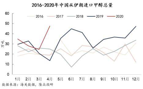 隆众资讯的数据显示,截止到2020年4月,伊朗甲醇产能约在1221万吨/年,占全球产能的21%,是仅次于中国的全球第二大甲醇生产国。而伊朗甲醇主要用于出口,中国和印度是主要买家,其中中国购买量占到伊朗出口量的65%左右。中国甲醇最大需求在甲醇制烯烃,而印度甲醇需求多在传统下游。受原油下跌和海外疫情的影响,二季度海外传统下游需求低迷。中国市场需求规模大且较为稳定,伊朗货主更愿意将货发往中国,以获得更高的利润回报。目前来看,外盘装置运行暂处于稳定状态,除南美地区部分装置以外,未有其他由于成本问题停车或者降幅,海外甲醇供应压力亦较为明显。