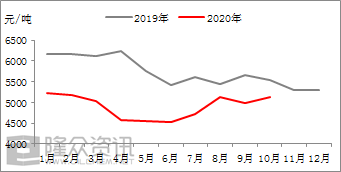 今年三聚氰胺行情整体弱于去年水平。2020年上半年受疫情影响较大,三聚氰胺价格维持在4500-5200元/吨之间波动,而下半年行情明显好于上半年,尤其是进入10月以来,三聚氰胺市场持续上涨,截至到11月6日,三聚氰胺出厂价格调涨至5700-6100元/吨,新疆地区部分承兑在5050元/吨左右,三聚氰胺价格首次突破6000元/吨大关。